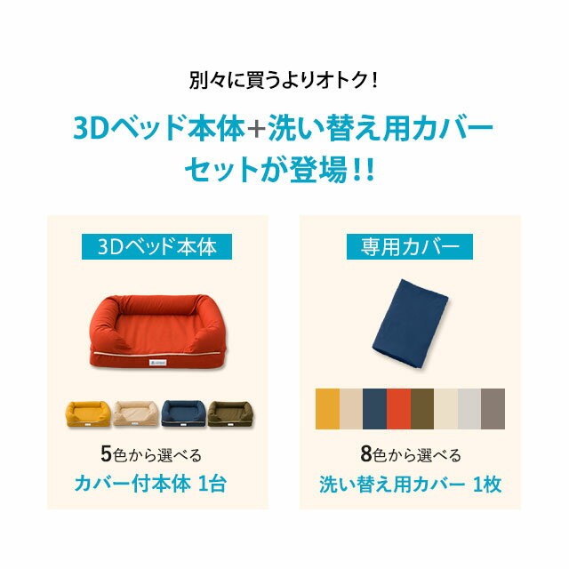 別々に買うよりオトク! 3Dベッド本体+洗い替え用カバーセットが登場! 私たちよりもたくさん眠る愛犬のために最高の寝具を 人間と同じくらいの体重の大型犬のワンちゃん達。